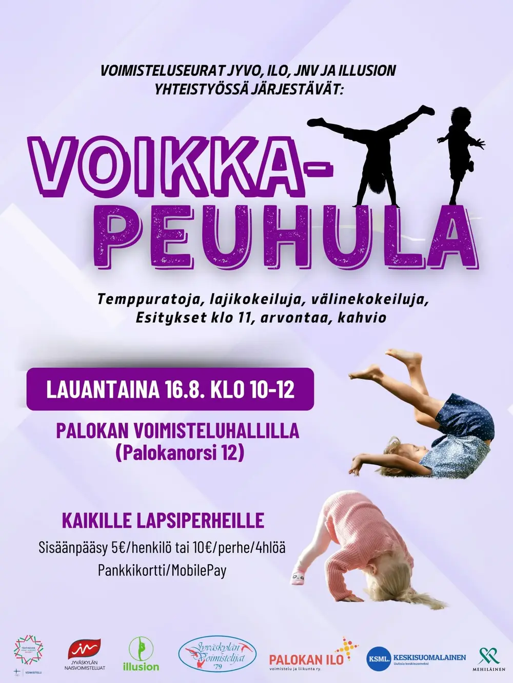 Palokan uusi voimisteluhalli täyttyy iloisesta liikunnasta Voikkapeuhula-tapahtumassa lauantaina 16.8. klo 10-12. Jyväskylän Voimistelijat, Palokan Ilo, voimistelu ja liikunta, Tanssi- ja…